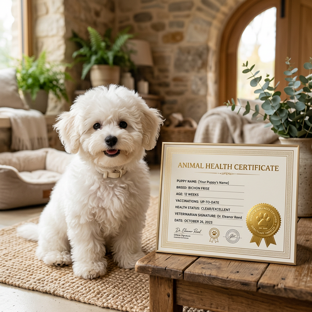 Each puppy undergoes a thorough veterinary examination before joining your family. We work exclusively with USDA-licensed veterinarians and follow all recommended health protocols for Bichon Frise puppies.